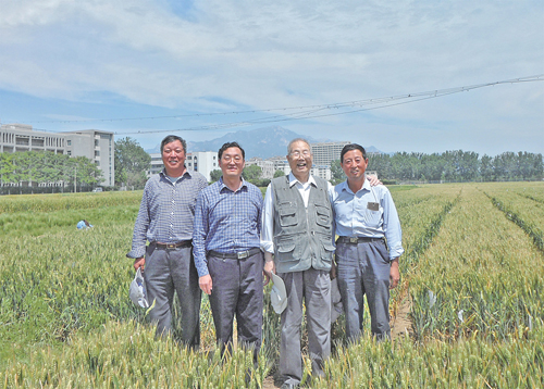 2010年5月,李晴祺教授(右二)考察beat365小麦新品种时与部分科研人员合影。(左二为本文作者)