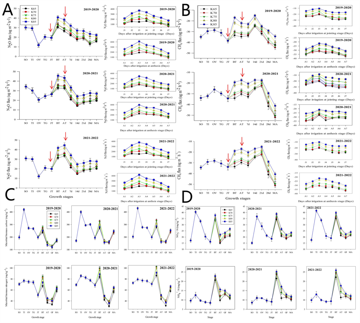 过量灌溉和降水会增加土壤有机物厌氧分解产生CH4排放和土壤反硝化产生的N2O排放,同时伴随着CO2排放。该研究发现,增加灌溉量显著提高了冬小麦生长季土壤N2O的排放,K85处理灌溉产生的较高土壤湿度促进土壤硝化作用,诱发大量的N2O排放。此外,K85处理下的土壤无机氮含量高,为土壤硝化和反硝化提供了反应基质,增加麦田土壤的N2O排放。同时,相关分析的结果表明,N2O通量与土壤水分、NO3--N和NH4+-N含量呈正相关。结果表明,适当的灌溉水平(K75)可通过降低无机氮含量来减少土壤N2O排放。