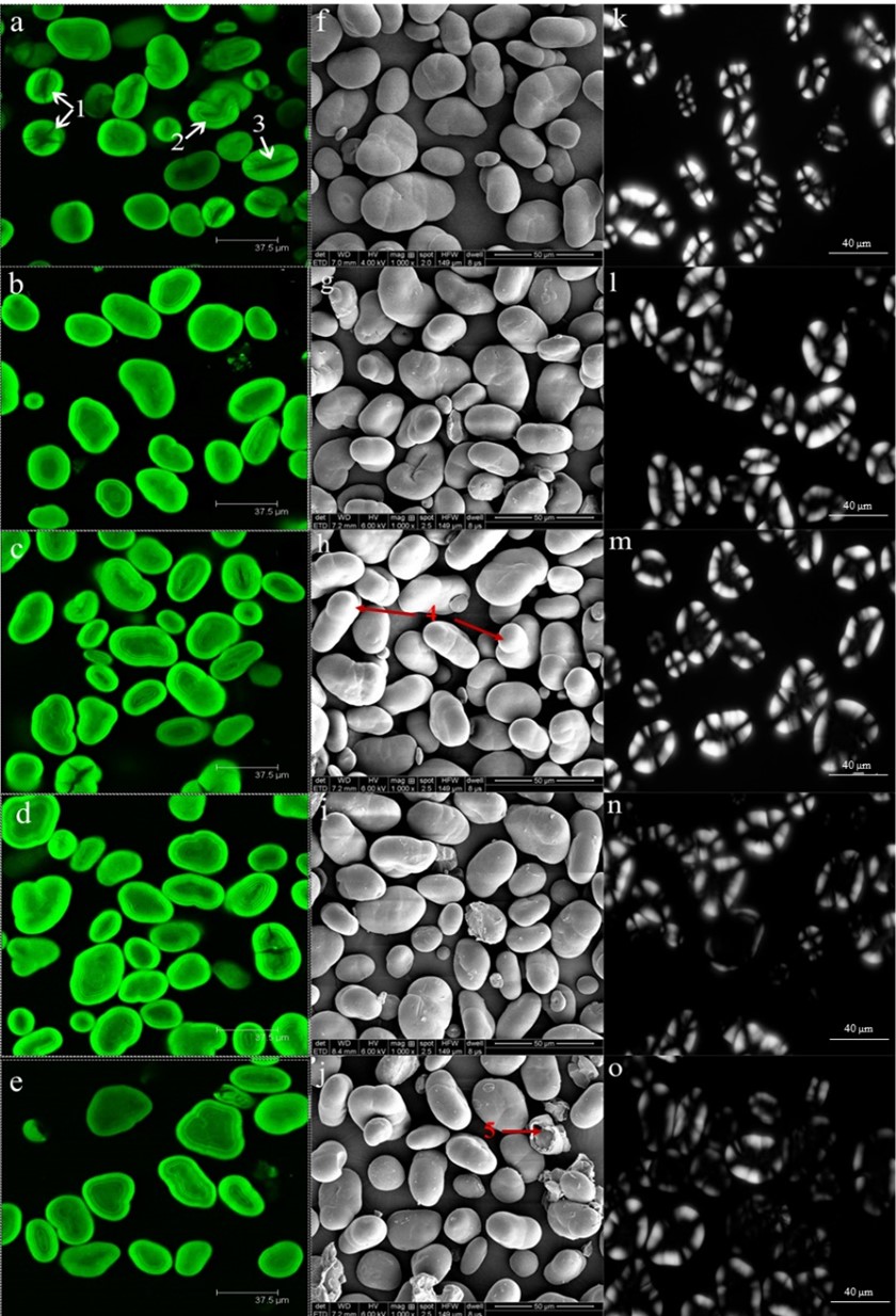 图1 天然绿豆淀粉和高静压改性绿豆淀粉的CLSM(a-e), SEM(f-j)和PLM(k-o)