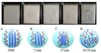 图2 高静压处理后淀粉悬浊液图(a-e)和在高静压处理期间淀粉分子变化的示意图(A-D)