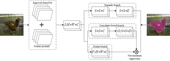 因此,本研究提出了一种用于家禽热应激状态监测的FPN-DenseNet- SOLO (FDS)模型。使用注意力机制(ECA)和DropBlock正则化优化DenseNet-169网络,在加强家禽热应激特征的提取,抑制无效背景特征的提取。该模型以SOLOv2模型为主体框架,将优化的DenseNet-169作为骨干网络,并融合特征金字塔模型,在语义分支与掩膜分支上对实例进行检测与分割。为测试FDS模型的性能,用12740幅家禽热应激和正常状态图像构成的测试集进行测试。测试结果表明,当DenseNet-169网络中没有添加ECA模块和DropBlock正则化模块时,原始的模型识别准确率为88.4%。ECA模块的引入使模型的识别准确率提高到91.9%。FDS模型在测试集上的召回率、AP0.5、AP0.75和平均精度均高于其他网络。其中,该模型的recall为0.954,分别比Mask R CNN、Faster R CNN和SOLO v2的recall提高了15%、8.8%和4.2%。本研究实现了正常和热应激状态下家禽的精确分割,为家禽的精确养殖提供了技术支持。