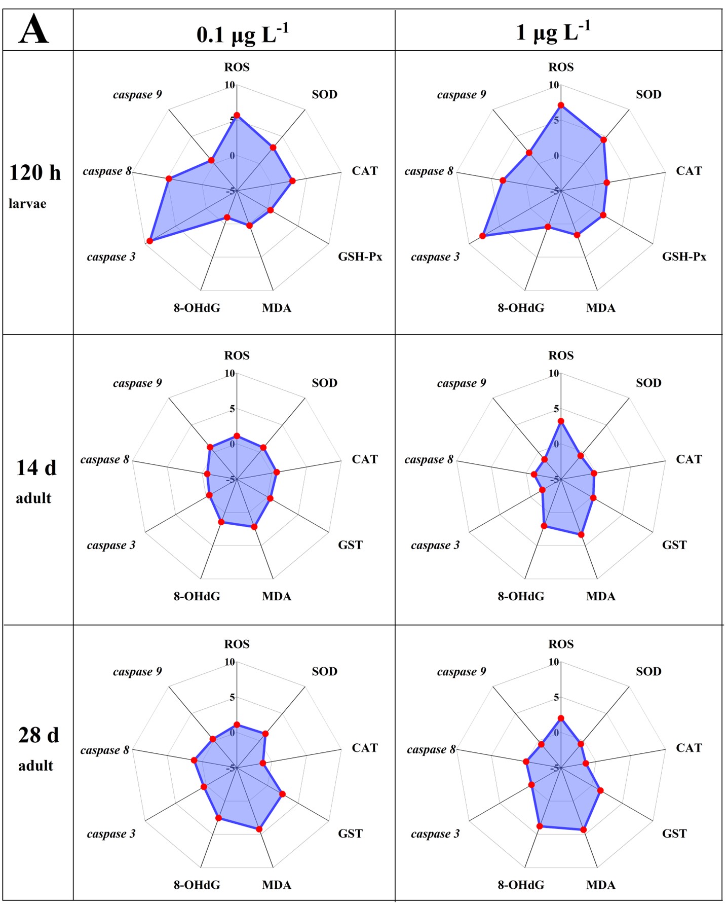 大多数化合物在进入生物体时会引起氧化应激。氧化应激是由外部污染引起的毒性作用机制之一,它可以改变生物体的免疫功能,导致细胞成分受损,严重时甚至导致细胞凋亡。该研究发现双氟磺草胺会使斑马鱼幼鱼和成鱼体内氧化应激相关指标活性氧水平显著升高并激活抗氧化系统。双氟磺草胺对斑马鱼幼鱼和成鱼均造成了脂质过氧化。双氟磺草胺未对幼鱼造成DNA损伤,但对成鱼造成了DNA损伤。凋亡相关基因caspase 3/8/9的表达变化说明幼鱼体内的细胞凋亡受到了诱导,而成鱼体内的细胞凋亡则受到了抑制。