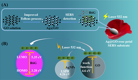 图1 (A)Ag@GO-玫瑰花瓣SERS底物的合成示意图和(B)电子转移路径示意图