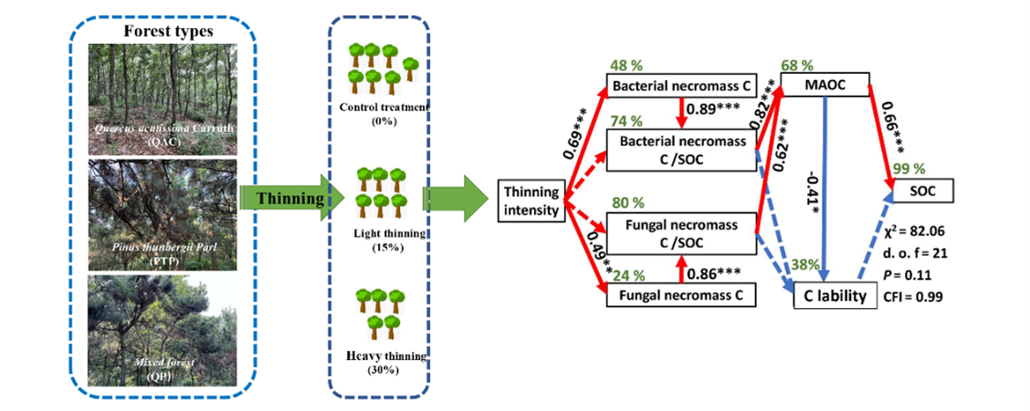 进展1:在期刊《Science of the Total Environment》发表了题为“The effect of thinning intensity on the soil carbon pool mediated by soil microbial communities and necromass carbon in coastal zone protected forests”的研究论文,博士研究生张子胥为第一作者,博士研究生郝茗为共同第一作者,高鹏教授为通讯作者,beat365英国官方网站为该研究成果的第一完成单位。