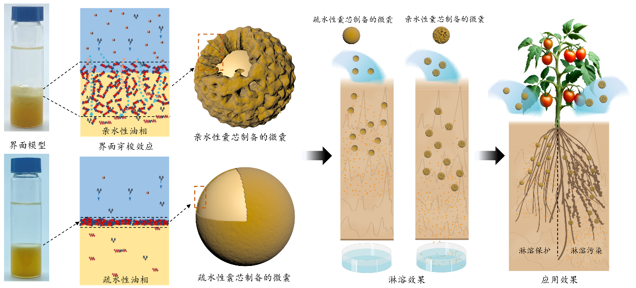 农药高效利用与环境安全团队以杀线剂噻唑膦(水中溶解度9 g/L)为模式农药,在高水溶性农药微囊制备和稳定机理方面取得了理论和技术突破。研究者首先利用不同极性程度溶剂改变囊芯体系的亲水性,发现随着亲水性增强,所成的微囊间粘连程度增加,壳层表面褶皱且变厚,而微囊释放速率却提高。为分析其原因,团队构建了能够将囊壳形成的微观过程宏观可视化的界面管式演化模型,发现并提出了“界面穿梭效应”,即当囊芯油相极性或亲水性较强时,水相单体容易越界进入油相,与油相单体MDI发生反应,随着水向油相传质深度的增加,界面膜虽逐渐增厚但却疏松多孔。而当油/水相亲和程度减弱时,水相单体仅与浅层油相的MDI发生聚合反应,因此形成的界面膜薄但致密,这种现象在微囊形成的微观过程中也得到了证实。在此基础上,研究者提出了控制界面穿梭效应的策略,通过利用疏水性强的溶剂降低油相亲水性、二次包覆以及增加油相粘度等措施,获得了壳层致密贮存稳定的噻唑膦微囊悬浮剂产品,能够延缓噻唑膦释放,进而缩短了随水施药时噻唑膦在土壤中的淋溶深度,将更多的噻唑膦集中在蔬菜根系周围,对根结线虫病防效比常规剂型制剂提高约20%,对蔬菜的药害也得到了极大控制。
