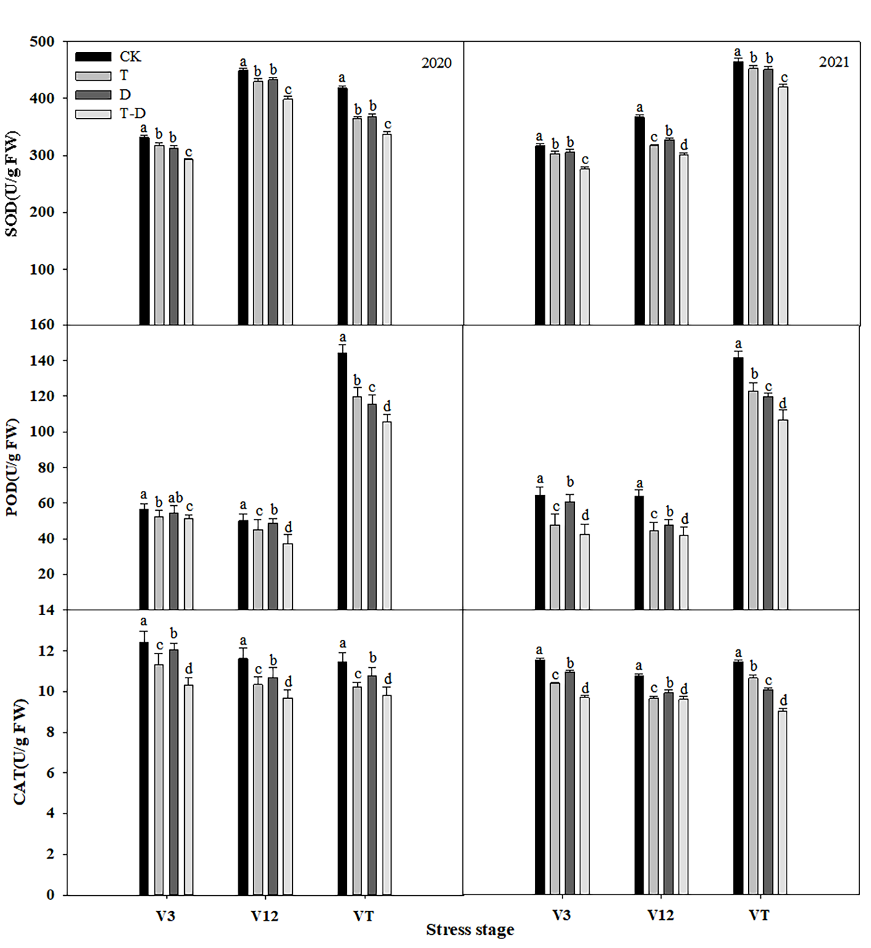 图1 不同生育时期高温、干旱及其复合胁迫对夏玉米抗氧化酶活性的影响