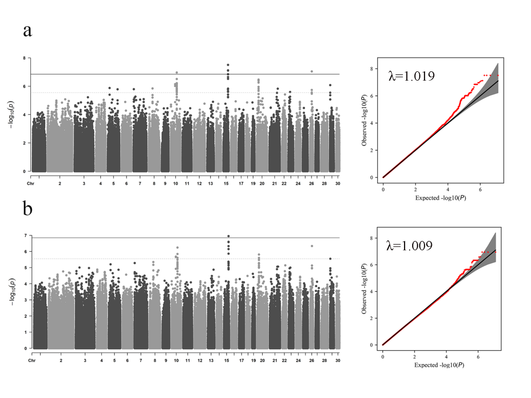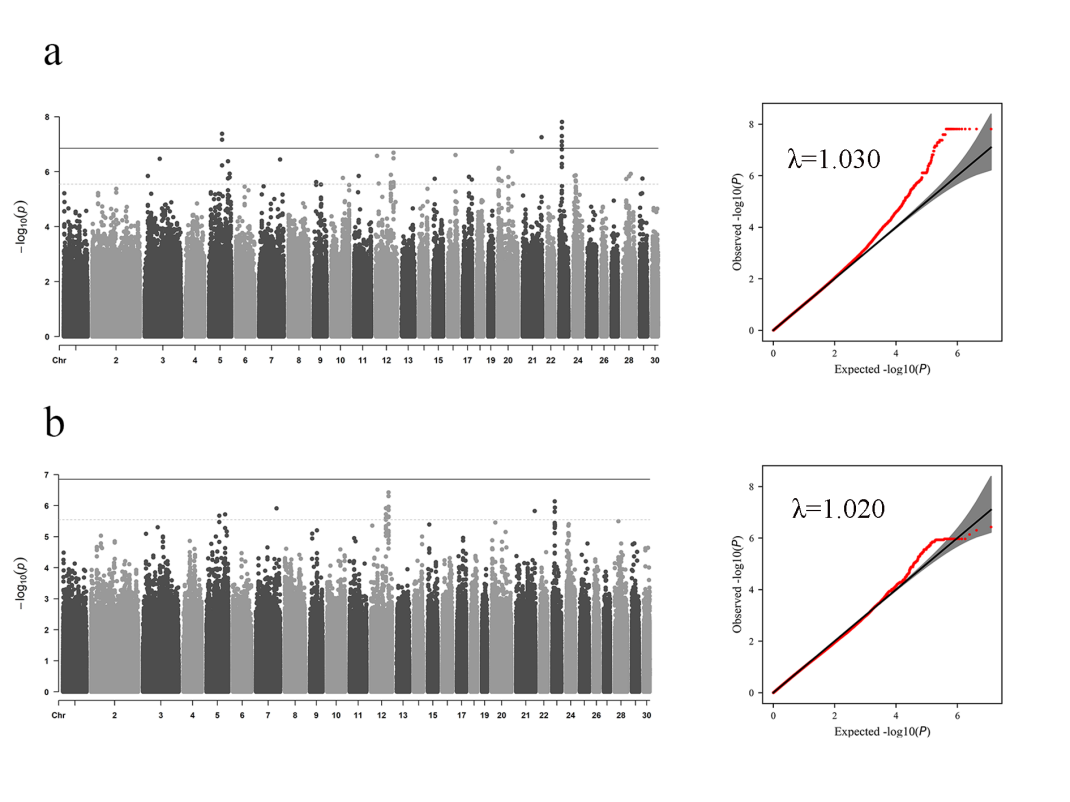 图1 胸椎数性状GWAS分析曼哈顿图和QQ图