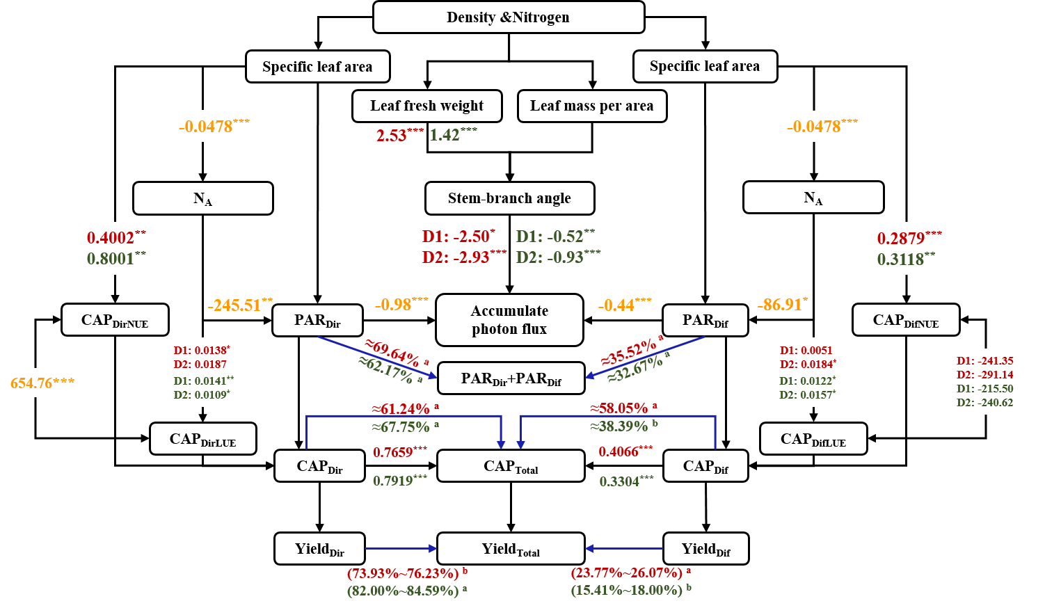 图2. 叶形,密度,氮肥差异对冠层光能利用的影响