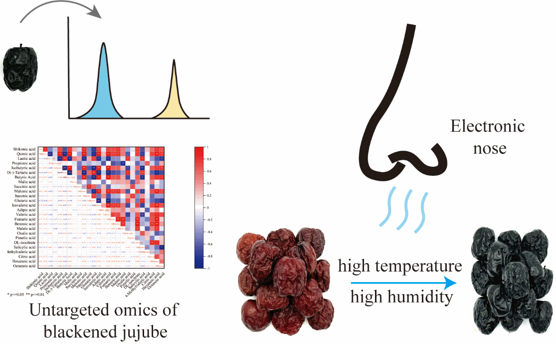 红枣是我国最具特色的民族药食同源果品之一,其所含的有机酸、多酚、黄酮、环磷酸腺苷等活性物质,具有重要的功能活性和健康益处。但目前红枣的资源利用率较低,深加工技术及新产品创制相对滞后,严重阻碍了红枣产业的发展。在高温高湿条件下,红枣经过固态发酵黑化过程所制备的黑枣被认为是近年来继黑蒜之后的一种创新加工产品,广受大众喜爱。该团队研究了黑化过程中枣的结构、有机酸和香气成分的变化,发现黑化后枣的质地发生明显改变,有机酸的变化赋予了枣独特的风味。为研究黑化过程的机制和产物提供了理论支持。论文成果得到了中央引导地方、山东省重点研发计划乡村振兴提振行动、德州市中小企业能力提升、德州市健康食品产业创新创业共同体等项目支持。