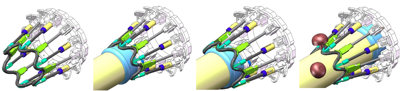 针对香菇生长密集、采摘易损伤、高速采摘等需求,该研究首创了香菇机械化采摘新模式,并创新设计了一种新型的香菇采收末端执行器(图1),实现低损伤、高效采摘。通过采摘过程动态过程(图2)的力学分析和有限元分析,明确了采收过程中末端执行器部件-香菇-菌棒的分离机理,优化了末端执行器的结构设计和作业参数,对提升采摘性能具有重要的理论指导作用。
