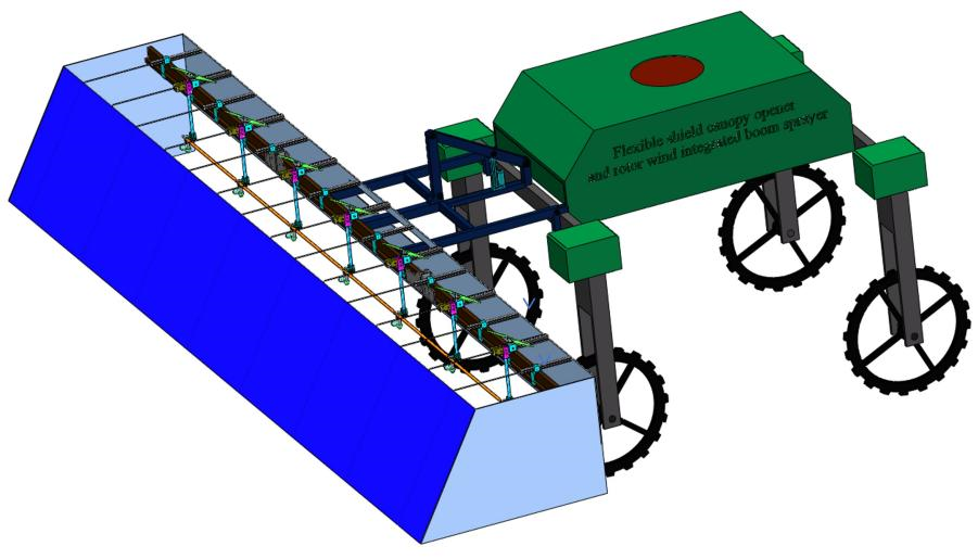 图2 新型柔性罩盖开冠器与旋翼风送一体化喷杆式喷雾机三维图
