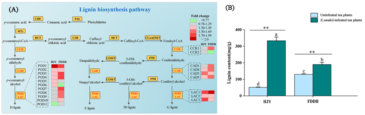 图2. 小贯小绿叶蝉取食对‘黄金芽’和‘福鼎大白茶’木质素通路的影响