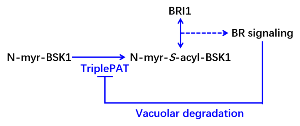 课题组进一步研究发现,C亚族棕榈酰基转移酶功能缺失,减弱了BSK1的棕榈酰化水平,抑制了BSK1与油菜素内酯受体BRI1的互作。有趣的是,BR诱导C亚族棕榈酰基转移酶从质膜向液泡的运输及降解,暗示PAT-BSK1作为BR途径中的一个负反馈模块发挥功能(图2)。