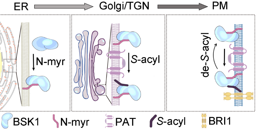 该研究中课题组通过T-DNA插入突变体结合CRISPR/Cas9基因组编辑技术,创制了拟南芥C亚族棕榈酰基转移酶PAT19/20/22的高阶突变体。其功能缺失表现为植株矮小,叶片窄,主根短,根分生区紊乱,气孔密度增加,以及黑暗下生长的下胚轴短等表型,类似油菜素内酯缺失突变体。课题组继而证明了C亚族棕榈酰基转移酶特异性地与BR途径关键胞质类受体激酶BSK1互作,并催化BSK1的棕榈酰化修饰。此外,BSK1作为一个受豆蔻酰化(N-myristoylation)和棕榈酰化修饰的非跨膜蛋白,棕榈酰化修饰确保了其从内质网-高尔基体靶向质膜的过程(图1)。这一机理可能普遍适用于植物细胞内双酯酰化修饰的非跨膜蛋白。