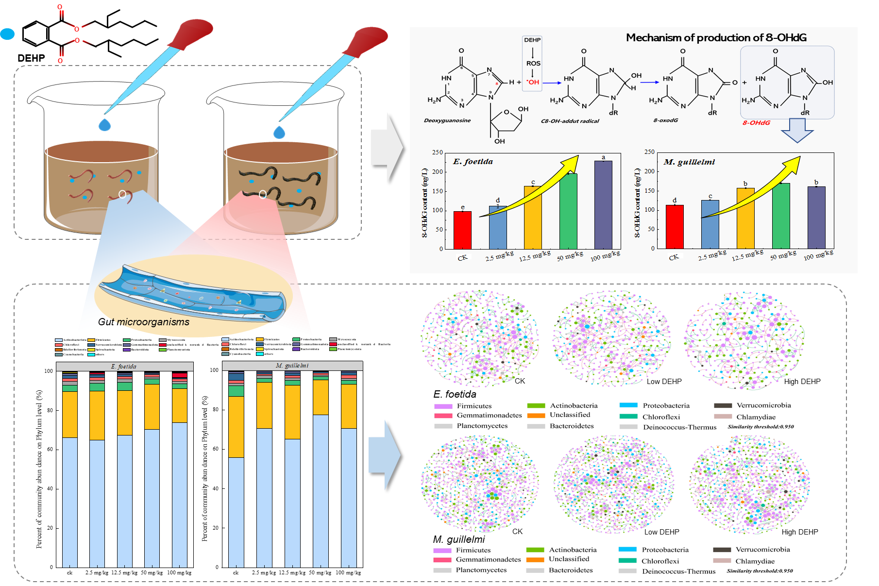 研究结果表明,DEHP显著诱导了Eisenia foetida(表栖型)和Metaphire guillelmi(内栖型)体内的8-羟基脱氧鸟苷(8-OHdG)含量,从而导致细胞内DNA损伤。同时DEHP对功能基因(ATP-6、NADH1、COX)的表达产生负面影响,在基因水平上扰乱线粒体呼吸和诱导氧化应激。尽管两种蚯蚓肠道表现出相似的优势菌群,而DEHP的加入均能显著抑制肠道微生物的均匀度和多样性,并进一步破坏肠道微生物生态网络的稳态。研究强调了在评估土壤生态健康和进行环境毒理学分析时需要考虑不同物种的综合生物学效应。