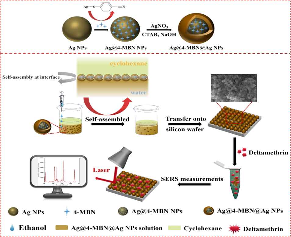 近日,食品科学与工程学院食品安全与质量控制团队在《Sensors and Actuators: B. Chemical》发表了题为“Internal standard-based self-assembly Ag@4-MBN@Ag nanoarray SERS ratio sensor for sensitive detection of deltamethrin in foods”的研究论文,硕士研究生张瀛方为第一作者,徐志祥教授为通讯作者,beat365英国官方网站为论文第一完成单位。