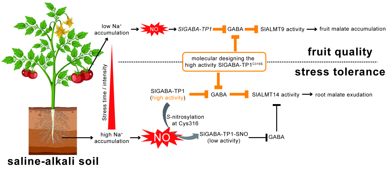 近日,园艺科学与工程学院巩彪教授团队在《New Phytologist》发表了题为Redesigning a S-nitrosylated pyruvate-dependent GABA transaminase 1 to generate high-malate and saline–alkali-tolerant tomato的研究论文。揭示了NO作为胞内信使,感知并传递盐碱胁迫信号,通过对SlGABA-TP1基因的转录调控及SlGABA-TP1蛋白的亚硝基化修饰调控,差异化控制根系和果实中的GABA积累水平,GABA通过与根系中的SlALMT14和果实中的SlALMT9蛋白互作,门控SlALMT14/9的苹果酸转运活性,促进根系苹果酸分泌和果实苹果酸积累,实现番茄盐碱抗性和果实品质的协同提升。