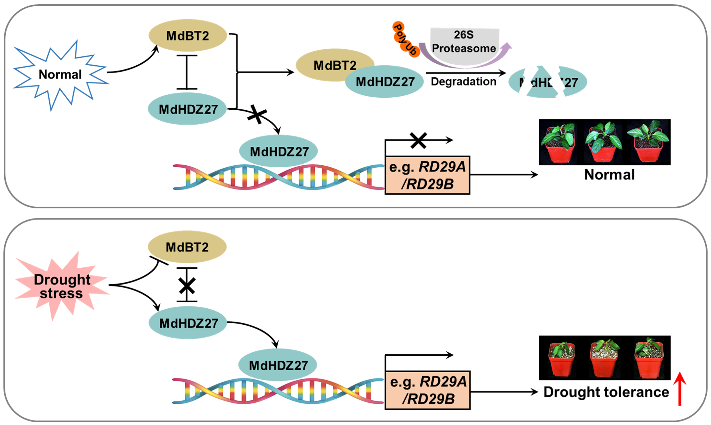 基于上述揭示的分子调控机制,该团队构建了MdBT2-MdHDZ27模块介导苹果耐旱性的分子调控网络,为研发提升苹果耐旱性的新技术、新方法和创制苹果耐旱新种质提供理论依据和有效靶位点。
