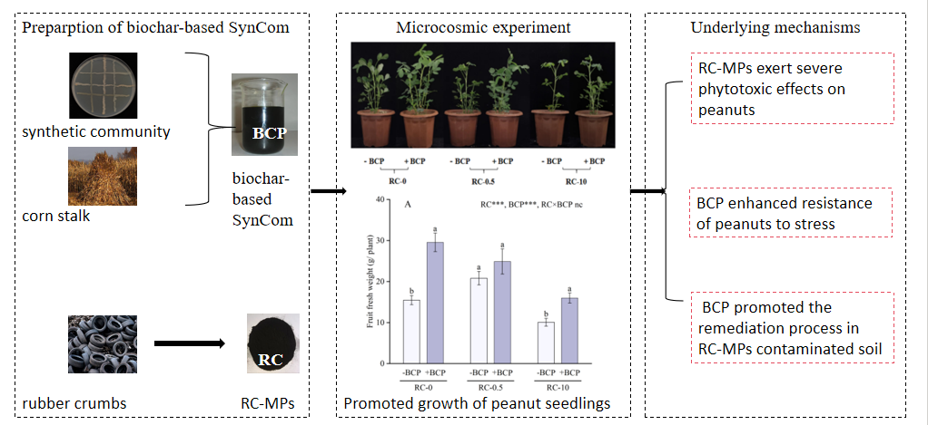 本研究通过筛选多功能花生根际促生菌并制备成复合菌剂,将其与生物炭复配成生物炭基微生物菌剂,通过盆栽实验研究生物炭基微生物菌剂在不同浓度RC-MPs胁迫下,对花生生长、土壤理化性质、根际微生物群落结构的影响。本研究发现添加生物炭基微生物菌剂处理后可显著提高了不同浓度RC-MPs胁迫下花生的生物量、根系活力、根瘤数、抗氧化酶活性以及土壤酶活性和根际细菌相对丰度。本研究证明了生物炭基微生物菌剂可以减轻RC-MPs对花生的毒性作用,并维持土壤微生物功能,为土壤污染的修复提供了一种新的解决方案,奠定了科学基础。