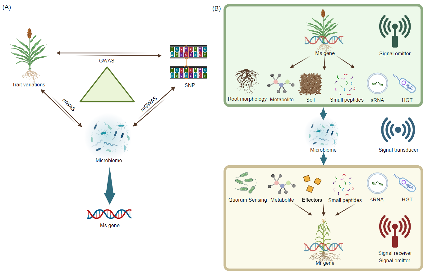 在过去几亿年的时间里,植物和微生物共同演化,这现在体现在当代植物-微生物相互作用的复杂性中。植物为各种微生物提供了丰富的生态位。反过来,这些受调控的微生物又可以与植物形成复杂的互作关系,深刻地影响植物健康。最近,“M基因”被用来描述在塑造微生物群落方面起关键作用的植物基因。这为基因-表型关系提供了新的见解,表明某些基因可能会影响相关的微生物群落,从而通过微生物相互作用间接影响植物的表型变异。部分基因以“自上而下”的方式塑造群落,而部分基因更容易受到微生物的影响,作为植物性状变异的“自下而上”的成因。为了进一步阐明微生物在植物适应环境中的调控作用,研究提出了将与微生物密切相关的宿主基因归类为微生物组塑造基因(Ms基因)和微生物组响应基因(Mr基因)。