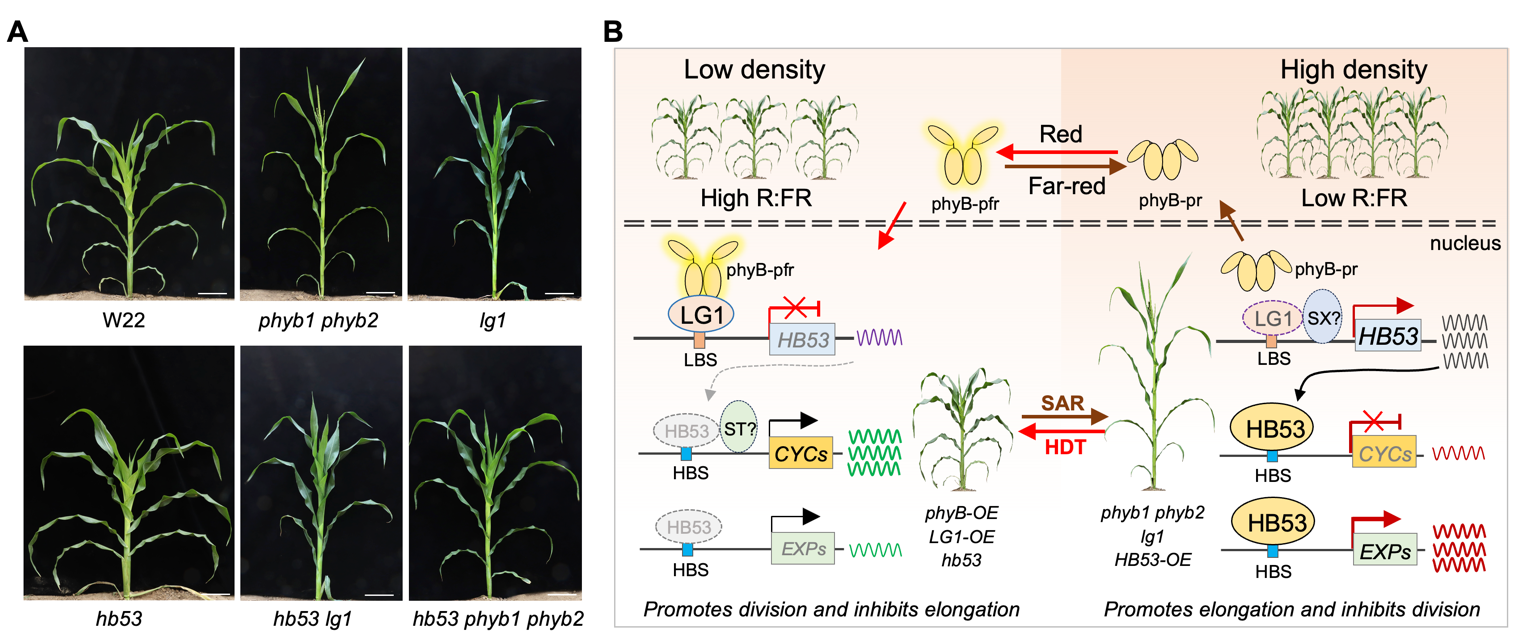图4. 玉米phyB-LG1-HB53调控模块介导株型建成和避荫反应的模式图