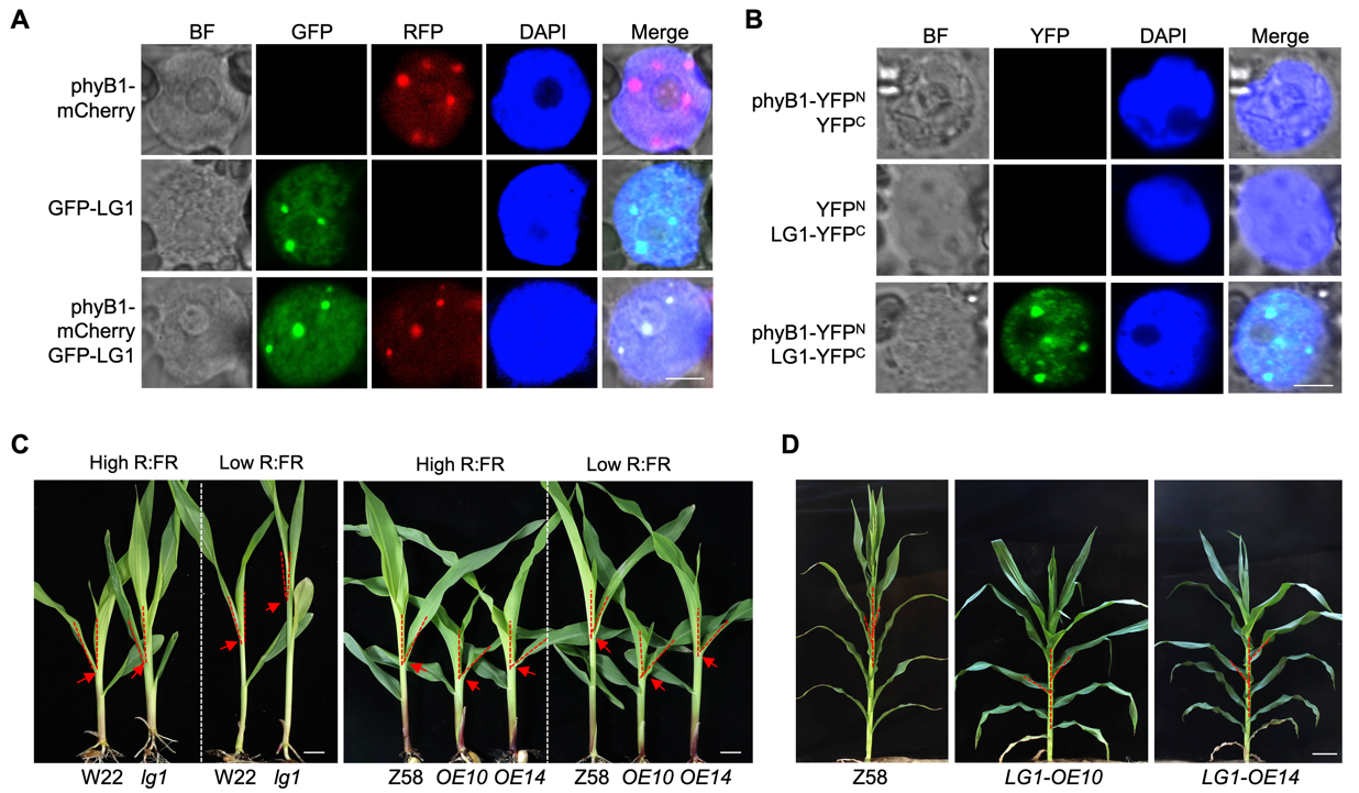 图2. 玉米phyB与LG1互作协同调控株型建成和避荫反应