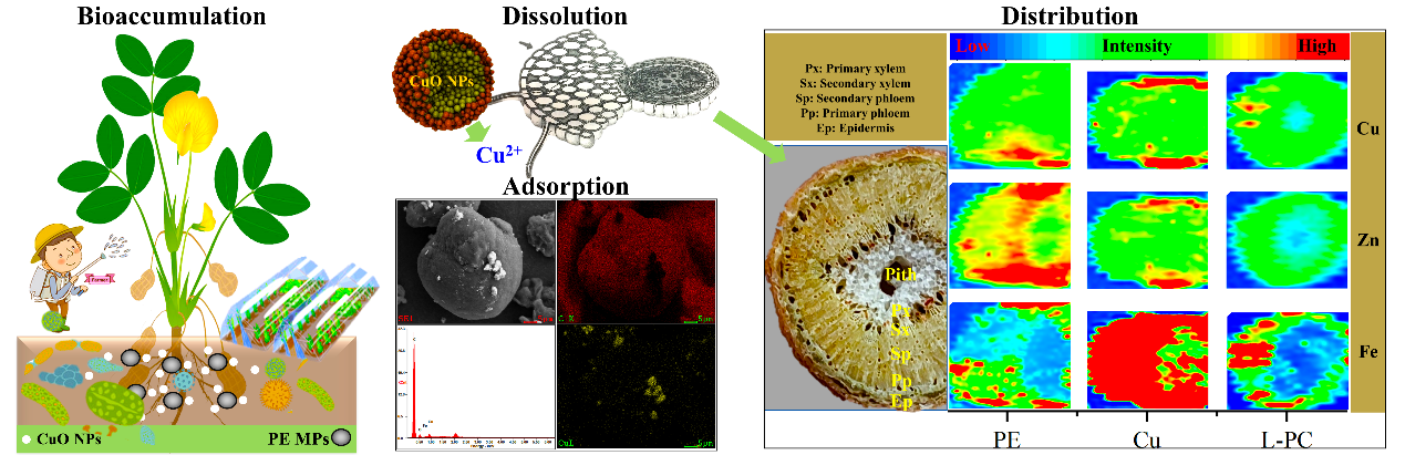 伴随着农用化学品的广泛应用,大量的农用化学品构成组分逐渐在农田环境积累。农药添加剂氧化铜纳米粒子(CuO NPs)和地膜主成分聚乙烯微塑料(PE MPs)作为伴随污染物在农业生产过程中不断在土壤环境中积累。因此,亟需开展相关污染物在土壤-花生系统中的环境行为、迁移路径和生态毒性效应研究,以评估典型污染物土壤蓄积对花生生长的毒性风险。