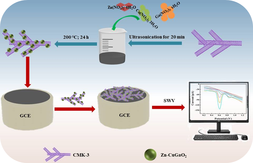 基于此,本团队研究了一种基于Zn-CuGaO2@CMK-3作为信号放大材料的高灵敏电化学传感器用于食品中日落黄和柠檬黄的同时检测。Zn-CuGaO2@CMK-3表现出更高载流子密度、更好的导电性和催化性能,更有利于对日落黄和柠檬黄的电化学氧化。基于Zn-CuGaO2@CMK-3构建的传感器对日落黄和柠檬黄的检测具有较宽的线性范围、较低的检出限和较高的准确性。这项工作表明,Zn-CuGaO2@CMK-3在食品危害物的电化学检测中具有广阔的应用前景。