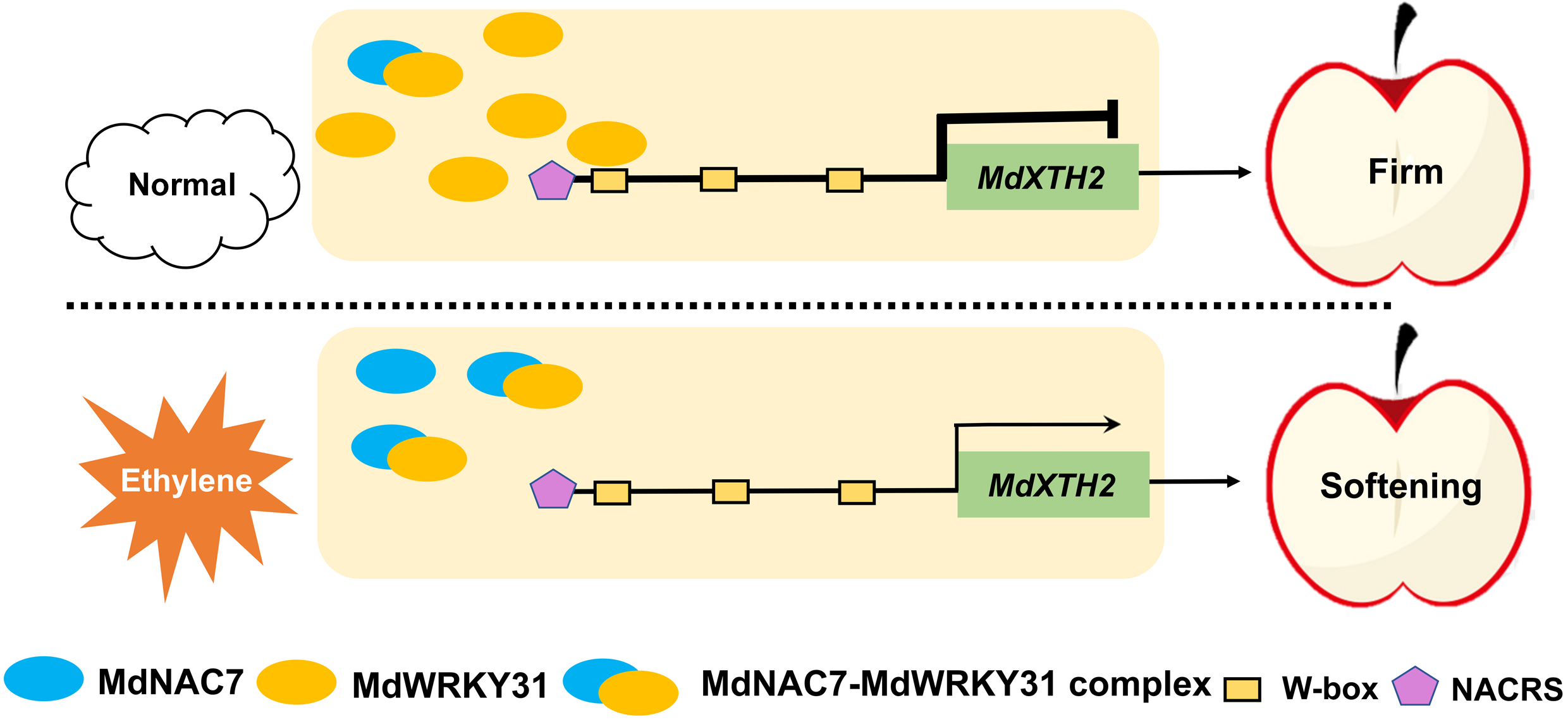 今日,beat365英国官方网站园艺科学与工程学院苹果果实品质生物学与营养健康团队在Plant Biotechnology Journal期刊上发表了题为“MdWRKY31-MdNAC7 regulatory network: orchestrating fruit softening by modulating cell wall-modifying enzyme MdXTH2 in response to ethylene signalling”(https://doi.org/10.1111/pbi.14445)的研究论文,揭示了乙烯调控苹果果实软化的分子机制。