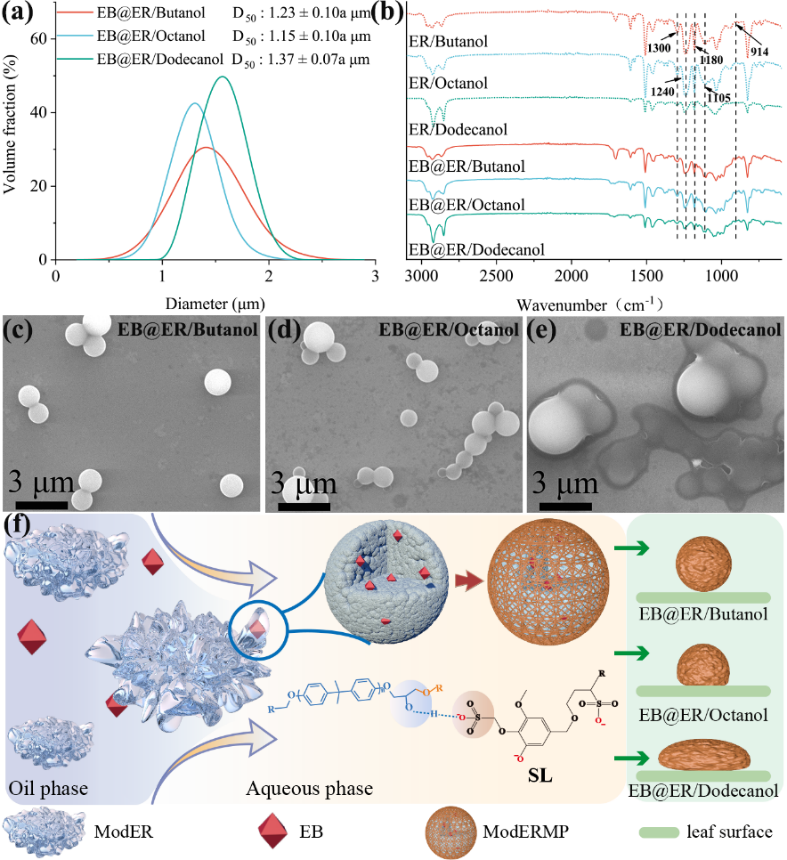 近日,植物保护学院薛超彬教授团队在Chemical Engineering Journal在线发表了题为“Epoxy resin gel particles with adjustable stickiness and deformability for pesticide delivery”的研究论文。该研究使用不同碳链长度的醇与环氧树脂一步反应,合成改性预聚物。随后,将含有甲维盐和预聚物的有机相与含有木质素磺酸钠的水相直接混合,通过自乳化和静电相互作用,得到载药环氧树脂凝胶颗粒。载药颗粒具有优异的柔性,从微米级的球形微粒可以形变为纳米级厚度的“饼型”微粒,且具有较强的黏性,可以黏附在昆虫的口器和足等部位,影响昆虫的取食和运动行为。同时,凝胶颗粒与水稻、甘蓝和黄瓜叶面的微/纳结构亲和性好,具有较强的抗雨水冲刷性能。该研究提供了一种具有简单制备工艺和优异抗雨水冲刷性能的农药递药体系。