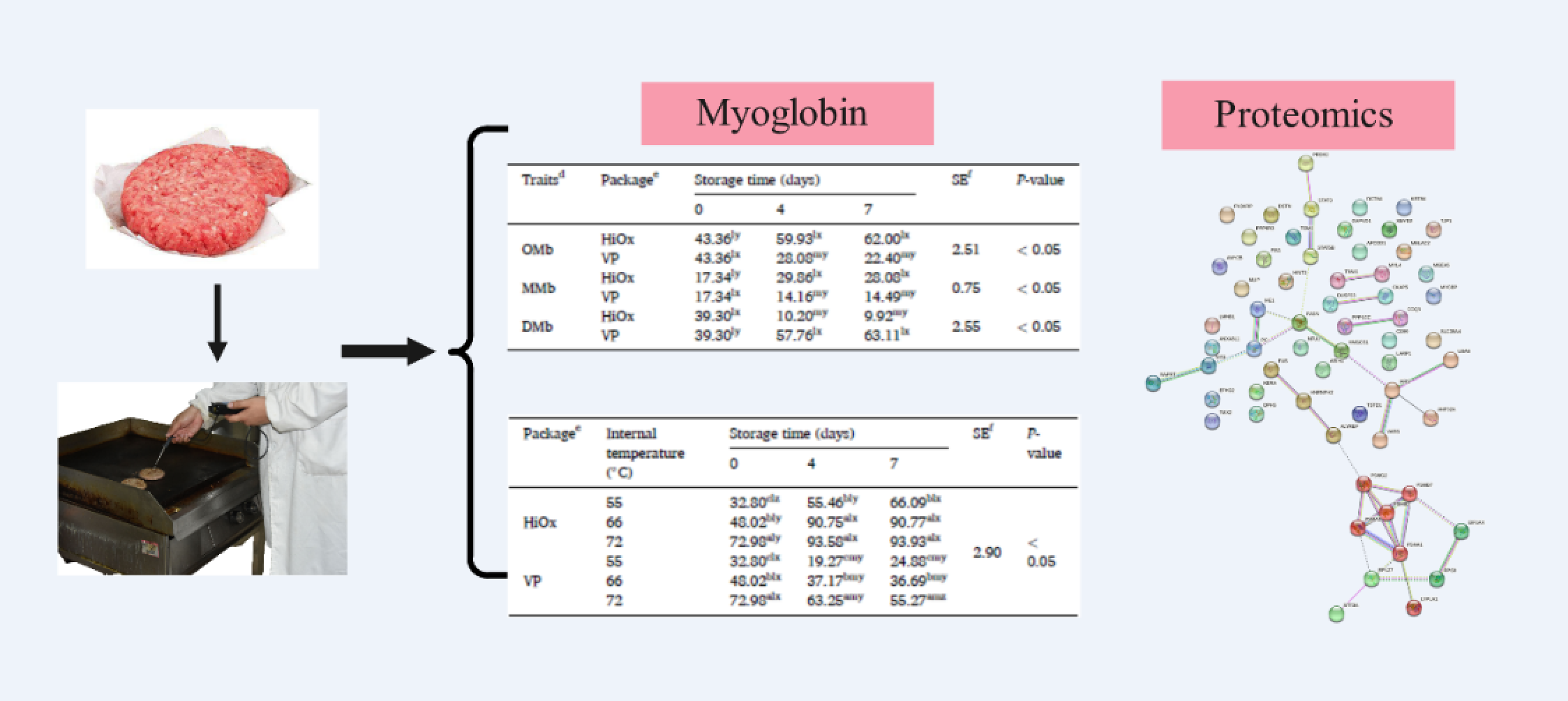 熟制肉色是消费者判断肉品熟制时熟制程度的最直观指标。提前褐变是牛肉在加热过程中发生的一种非典型颜色变化,即牛肉尚未加热至完全熟制的温度时,中心肉色提前呈现完全熟制时的棕褐色的现象。该现象容易使消费者对肉品的熟制程度产生误判,而提前终止加热,导致杀菌不充分。消费者食用未加热至安全温度的牛肉时,被食源性致病菌感染的概率大大增加。对此,该研究测定了高氧气调包装和真空包装牛肉饼熟制前后的肉色、熟制后的肌红蛋白变性程度和加热过程中的蛋白质组学等的变化,旨在从分子层面揭示熟制牛肉提前褐变的产生机制,为该现象的控制提供理论支持。