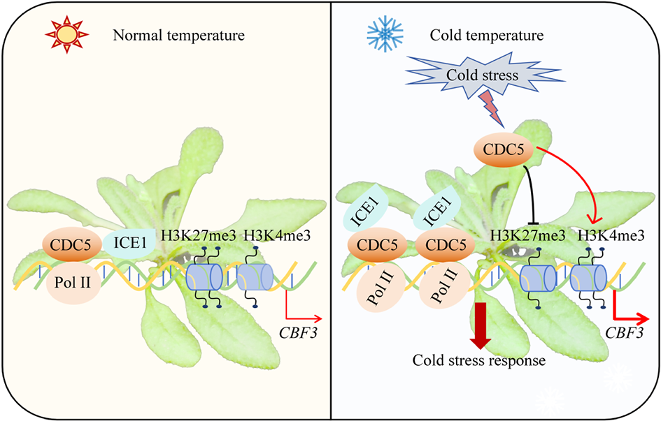 该研究发现,在冷胁迫下,CDC5会明显被诱导。 CDC5的突变体对冷冻条件十分敏感,与野生型(Col-0)相比,冷冻处理后CDC5突变体的电解质外渗率更高。CDC5与ICE1相互作用并且结合到CBF3的启动子上激活其表达。此外,冷胁迫条件下,CDC5可以招募更多的RNA聚合酶II (Pol II)到CBF3的启动子上来调控CBF3的转录。此外,CDC5还可以通过促进CBF3染色质的H3K4me3水平以及抑制CBF3染色质的H3K27me3水平来促进CBF3的表达。