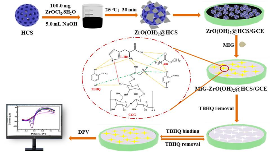 基于此,本团队采用L-组氨酸在室温下通过分子间氢键和静电相互作用将阳离子瓜尔胶、丙烯酰胺和TBHQ快速交联,制备了一种新型的ZrO(OH)2@HCS信号放大的分子印迹凝胶(MIG)电化学传感器,用于高灵敏度、高选择性地检测TBHQ。ZrO(OH)2@HCS具有优异的电导率和水分散性,被用于信号放大。在最佳条件下,MIG-ZrO(OH)2@HCS/GCE传感器具有较好的选择性、较宽的动态检测范围和较低的检测限。