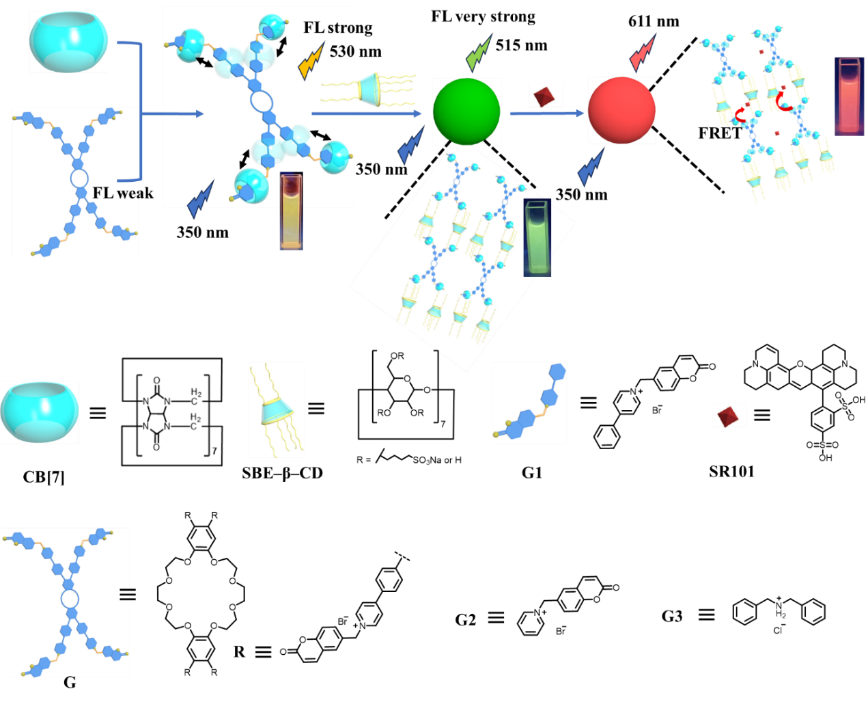 在现代社会,信息存储和生物成像技术的发展日新月异,但如何实现高效、多色的信息存储和细胞成像仍然是一个挑战。传统的荧光材料在信息存储和生物成像中的应用受限于其荧光强度和寿命的不足,难以满足复杂多样的应用需求。因此,开发一种能够实现多色荧光信息存储和细胞成像的新型材料显得尤为重要。研究团队首先通过大环限域激活假[5]轮烷的黄色荧光,并进一步与阴离子环糊精(SBE-β-CD)共组装,形成绿色荧光超分子组装体。在此基础上,通过掺入近红外染料硫罗丹明101(SR101)受体,使得G@CB[7]4@SBE-B-CD/SR101的能量转移效率高达79%,并在365 nm照射下颜色从绿色变为红色。最后,通过添加二苄基氯化铵,实现了G@CB[7]4、G@CB[7]4@SBE-B-多色可调荧光发射,并被应用于多色荧光信息存储和细胞成像。