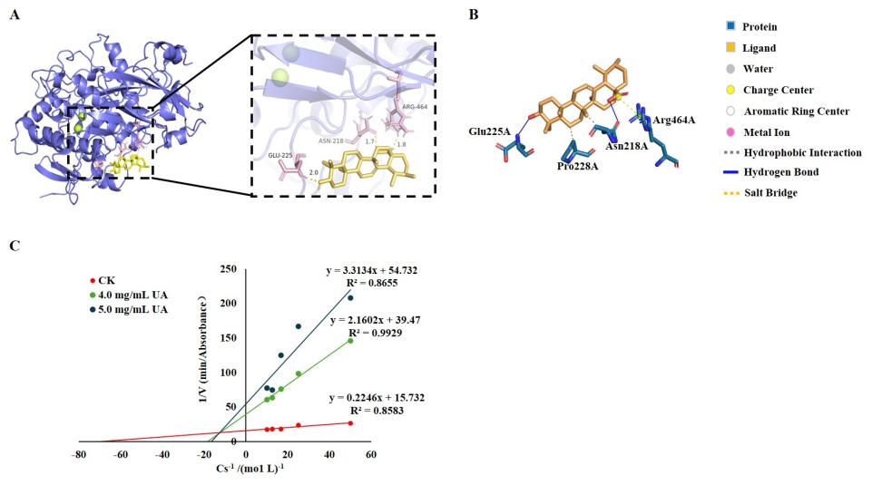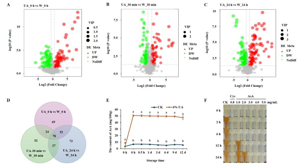 本研究首先将UA应用于苹果浆液与鲜切苹果,发现UA能显著抑制其褐变,因此对UA抑制褐变机制进行了进一步研究。研究主要探讨了UA对苹果多酚氧化酶(PPO)的作用机制,通过测定UA铜离子螯合能力、PPO酶促动力学及分子对接等初步判定UA对苹果PPO的抑制类型为可逆的混合型抑制。通过测定过氧化物酶(POD)、超氧化物歧化酶(SOD)、过氧化氢酶(CAT)活性,DPPH、ABTS抑制率,H2O2和O2•−含量可知,UA处理可通过提高鲜切苹果抗氧化能力以及活性氧清除能力实现鲜切褐变抑制。由非靶向代谢组学结果分析可知,UA可通过调控抗坏血酸、乌头酸等具有强抗氧化能力物质的含量来抑制鲜切苹果褐变。此外UA可抑制鲜切苹果表面微生物的增长且在栗子、茄子、马铃薯和雪梨等果蔬褐变中具广谱抑制效果。本研究为植物内源性天然褐变抑制剂的开发开辟了新的方向,为UA在鲜切果蔬行业的应用奠定了理论基础。