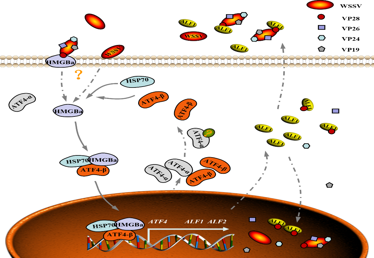 白斑综合征病毒是导致虾死亡的主要病原体,是已知最大的双链DNA病毒(300 kb)。白斑综合征病毒感染每年造成虾蟹养殖的巨大损失,解析宿主抵御病毒感染的分子机制可为病毒病防控提供有力的理论支撑。转录激活因子(ATFs)不仅可以调节癌细胞的增殖、维持细胞氧化还原动态平衡、延长生物寿命还可以响应病原微生物的刺激。ATFs在抗病毒免疫的功能尚需进一步研究。本研究在克氏原螯虾中鉴定到ATF4的两个同源物(ATF4-α和ATF4-β),ATF4-β相较于ATF4-α相比缺少一个β折片结构(7 AA)。在WSSV感染后,ATF4-β主要被激活进入细胞核发挥功能。HMGBa和HSP70都只与ATF4-β相互作用,并且ATF4-β进入细胞核依赖HMGBa和HSP70的协助。ATF4-β进入细胞核后起始抗脂多糖因子(ALF1和ALF2)的转录。ALF1通过与病毒囊膜蛋白VP28相互作用抑制WSSV的组装和再感染。本研究阐明了HMGBa- HSP70-ATF4-β轴参与抗囊膜病毒免疫反应的分子机制,可为白斑病的防控提供一定理论参考。