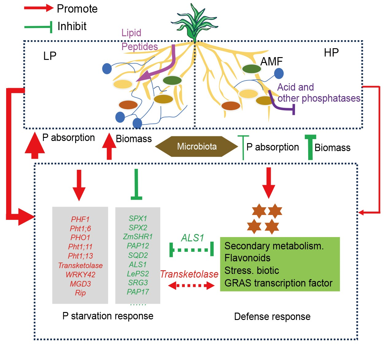 植物根系定殖大量土壤微生物,这其中既存在有益微生物以促进植物生长,也存在有害微生物抑制植物生长。植物磷饥饿响应(PSR)基因不仅是植物信号转导和磷稳态的调控模块,而且在调节植物与微生物间的相互作用过程中起关键作用。然而,目前已有研究主要针对单一微生物种类与其宿主间的相互作用,宿主植物如何在转录水平上整合对土壤微生物群定殖的响应,以及土壤磷水平如何影响这一过程,还需要进一步研究。