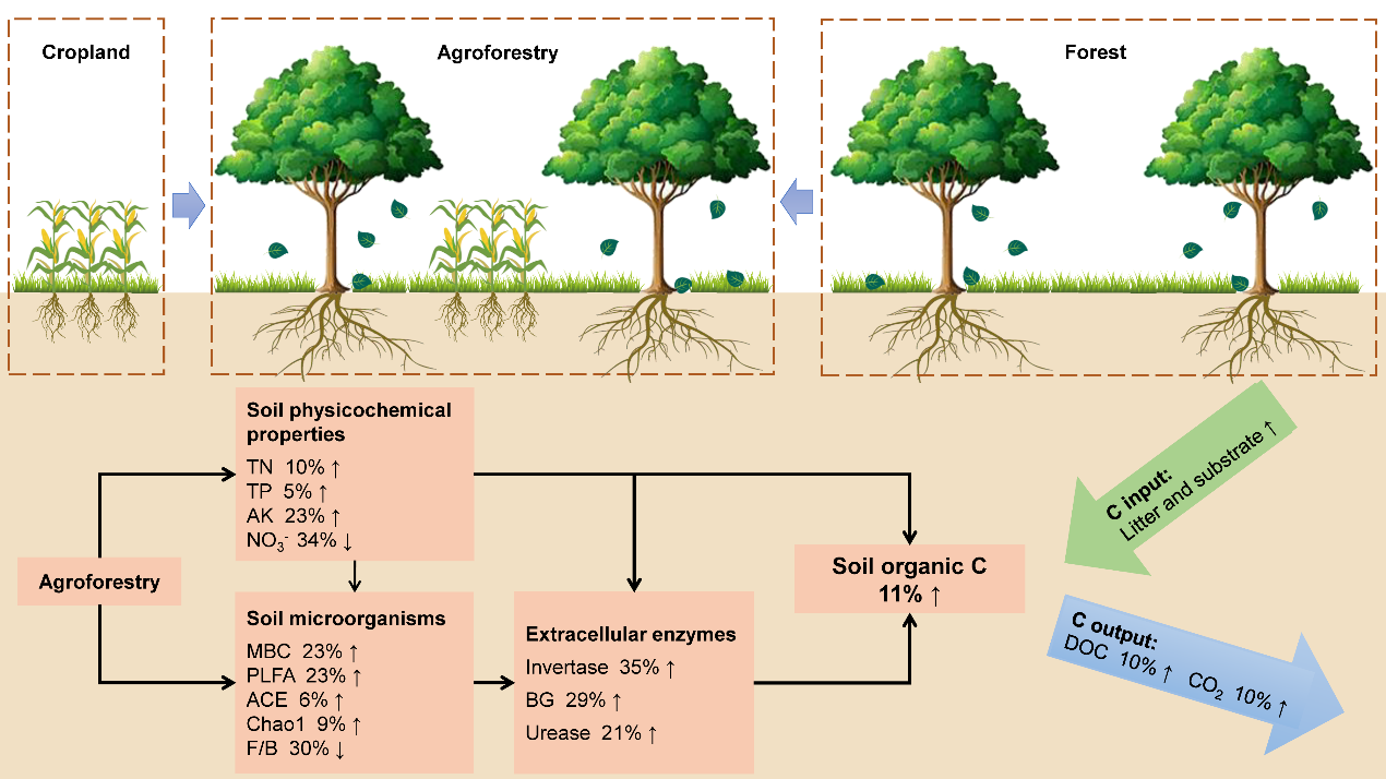 农林复合作为一种动态的、以生态为基础的自然资源管理系统,可以改变植物碳的输入和微生物介导的碳输出,进而影响土壤有机碳的积累。然而,目前还缺乏对全球范围内农林复合固碳潜力的定量分析。在此,通过收集全球561对观测数据进行荟萃分析,以量化农林复合对土壤有机碳固存以及土壤特性和微生物的影响。与其他土地利用方式(耕地、森林和未开垦土地)相比,农林复合平均增加了10.7%的土壤有机碳、10.2%的溶解性有机碳和10.2%的二氧化碳排放量。在所有气候区中,干旱地区农林复合的土壤有机碳增加最多(18.7%)。与单一种植模式相比,农林复合在微生物生物量、多样性和土壤养分含量方面更具优势。本研究结果表明农林复合作为一种恢复、保护和减缓气候变化的种植策略值得推广,尤其是在干旱地区。