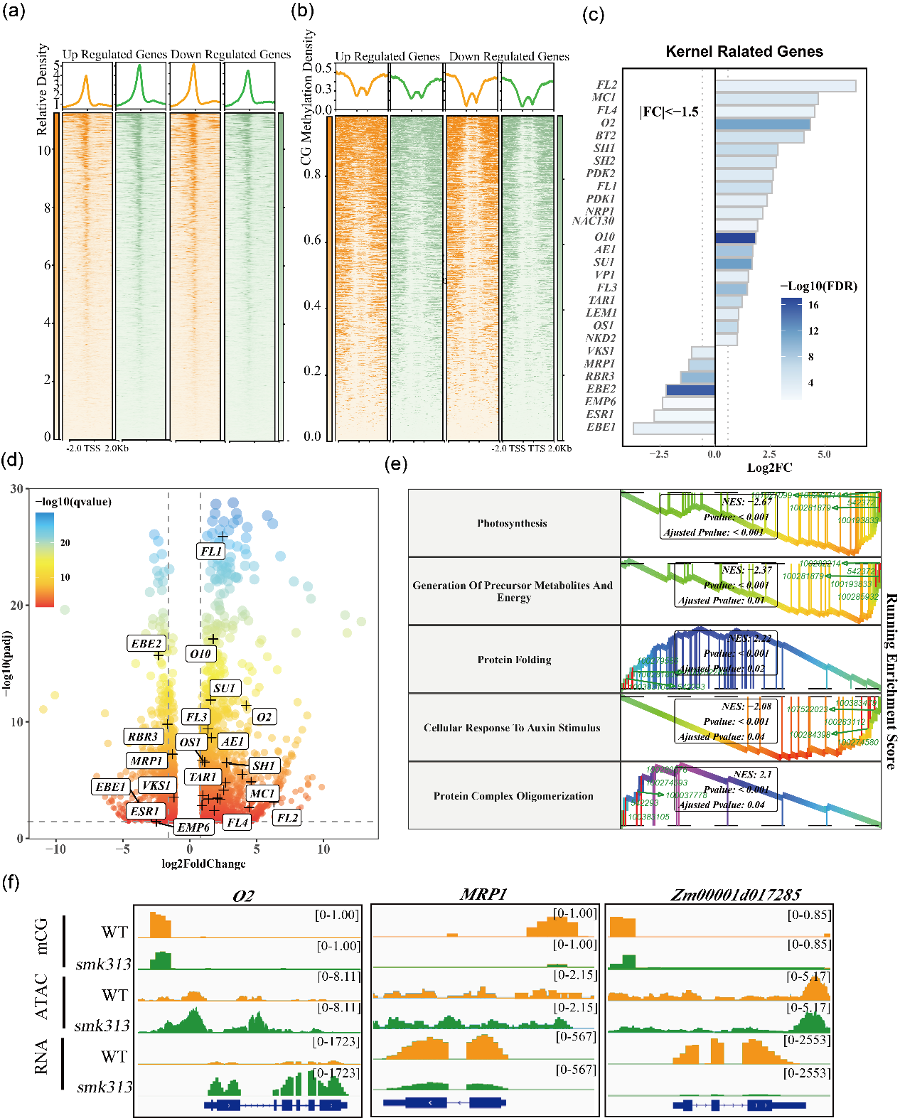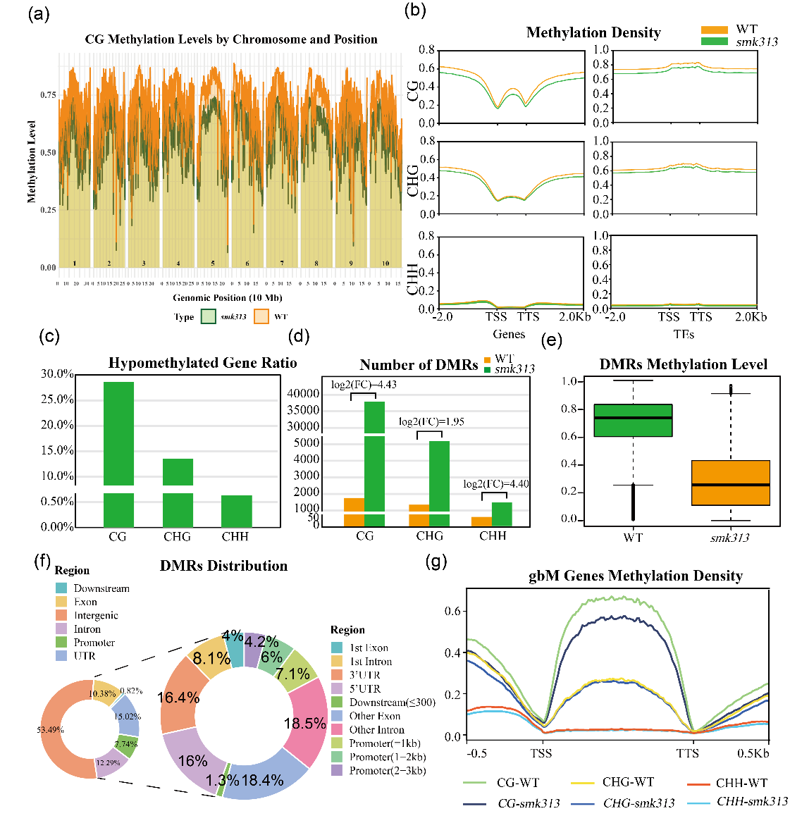 近日,beat365英国官方网站张宪省/赵翔宇团队在The Plant Journal在线发表题为“Role of Methyltransferase 1-Dependent DNA Methylation in Affecting Maize Kernel Development”的研究论文。研究者前期在EMS玉米突变体库中发现了一个籽粒突变体smk313,粒重相较于野生型明显下降,早期籽粒的胚和胚乳发育异常,但是能够进行正常的营养生长和生殖生长。籽粒显微结构显示,smk313突变体籽粒中的胚乳细胞减小,BETL和EAS细胞发育异常。全基因组甲基化测序显示,突变体CG DNA甲基化低于野生型,且存在较多的低DMRs。结合ATAC-seq和RNA-seq数据集,CG甲基化的下降会引起染色质可及性改变进而影响籽粒发育相关基因的表达。以上结果表明,ZmMET1在维持籽粒发育相关基因的CG甲基化的过程中发挥着关键作用。