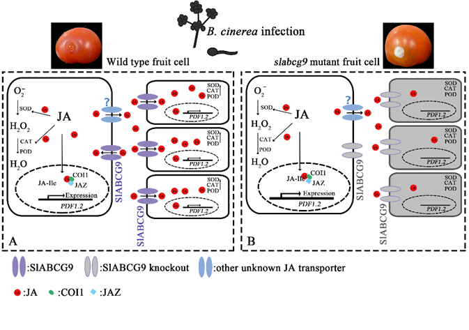 该研究首次在番茄中鉴定到一个质膜定位的茉莉酸(Jasmonic Acid, JA)转运蛋白SlABCG9。SlABCG9发生突变后,JA进入细胞被阻断,细胞内JA含量降低,番茄抗性基因PDF1.2的表达受到抑制,抗氧化活性降低,番茄果实对灰霉的抗性降低。本研究揭示了SlABCG9在番茄果实贮藏期抗灰霉病中的关键作用,为制定减少番茄采后损失的策略提供了新的思路,也为研究小分子激素在其他水果和蔬菜中的转运提供了重要参考。