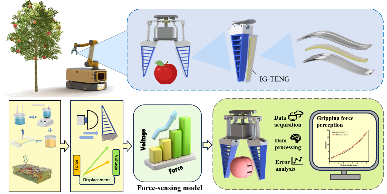 针对以上技术难题,研究团队制备了一种基于摩擦纳米发电机的柔性自驱动力感知传感器(IG-TENG),并成功应用于新鲜果蔬的无损采摘。实验结果表明,IG-TENG 具有卓越的可拉伸性、良好的电输出性能以及长期工作稳定性。在0-20 N内表现出高灵敏度(3.53 V/N)、良好的线性度(R²= 0.989)以及对不同抓取位姿的良好适应性,力感知准确率高达 93.77%。此外,该传感器凭借制造工艺简单、可扩展,成本低、无污染和自供电等优势,在柔性电子、智能机器人、农业采摘及可穿戴设备等领域展现出广阔的应用前景。