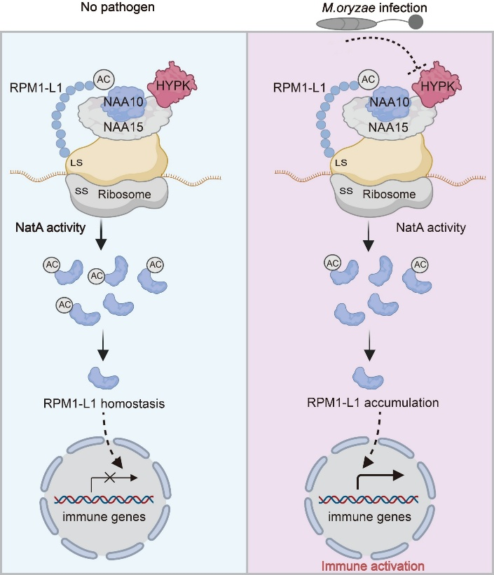 OsHYPK/NatA-RPM1-L1平衡水稻生长与抗病的工作模型