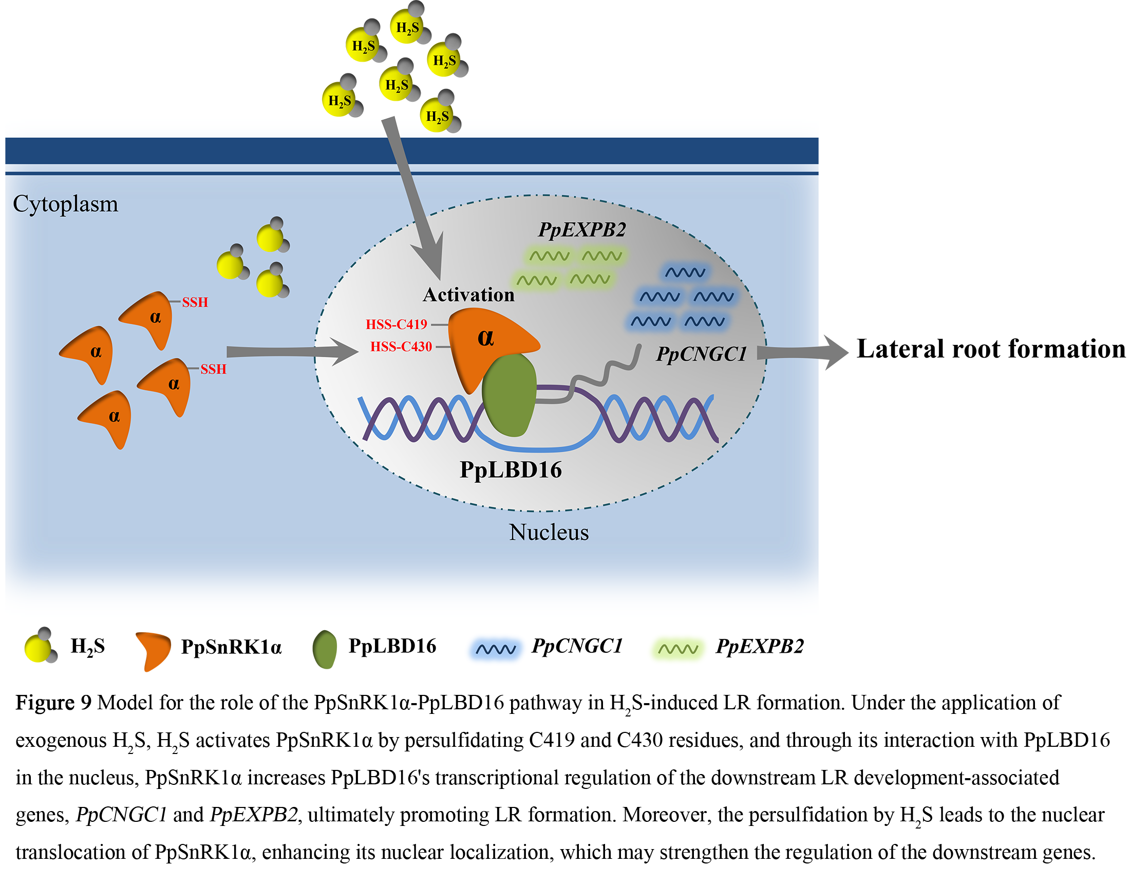 该研究发现,在H2S诱导的桃侧根发育过程中,PpSnRK1激酶被外源H2S激活,其活性介导H2S促进桃侧根形成。通过过硫化及LC-MS/MS分析发现,H2S对PpSnRK1激酶α催化亚基上Cys419、Cys430和Cys505位残基进行了过硫化修饰,该修饰介导H2S对PpSnRK1活性的诱导,并且通过氨基酸位点突变实验证实过硫化位点Cys419和Cys430在H2S诱导的侧根形成过程中发挥着关键作用。通过蛋白互作分析进一步发现,PpSnRK1α能与侧根形成核心调控因子PpLBD16在细胞核中发生相互作用,外源H2S处理会加强PpSnRK1α的核定位。通过转录检测及互作验证发现,PpLBD16下游靶基因PpCNGC1和PpEXPB2转录受H2S-PpSnRK1α途径诱导。PpSnRK1α与PpLBD16互作增强了PpLBD16对这两个靶基因的转录激活,从而促进侧根形成。表达模式分析进一步显示,PpSnRK1α、PpLBD16及其靶基因的转录在桃侧根原基发育过程中显著增加,它们位于桃侧根原基中强烈表达,与桃侧根原基发育密切相关。综上所述,本研究不仅揭示了H2S-PpSnRK1α-PpLBD16信号模块调控桃侧根形成的分子机制,还为气体信号分子H₂S与能量信号激酶SnRK1之间的交互作用提供了理论依据。该成果可为桃根系构型的精准调控和桃园养分的高效利用提供创新性理论支撑。