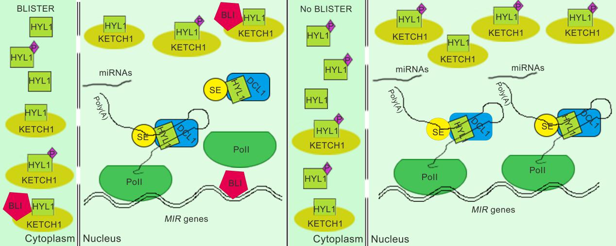 近日,beat365英国官方网站张数鑫团队在Nucleic Acids Research发表了题为“Plant-Specific BLISTER Modulates miRNA Biogenesis by Regulating MIRtranscription, HYL1 Phosphorylation and Nuclear Transport in Arabidopsis”的文章。本研究发现,植物特异性蛋白BLISTER(BLI)通过调控MIR基因转录、HYL1磷酸化及HYL1运输,在miRNA生物合成中发挥关键作用。bli突变体表现出特定miRNAs的异常积累,同时HYL1组成的D-小体形成增强。生化证据表明BLI负向调控MIR基因转录。此外,BLI通过促进HYL1去磷酸化进而加速其降解。值得注意的是,BLI与KETCH1互作共同协调HYL1的核输入机制。该研究确立了一种新型调控范式:植物特异性蛋白通过整合转录调控与翻译后修饰来协调miRNA生成,这一发现深化了我们对植物基因调控机制的理解。