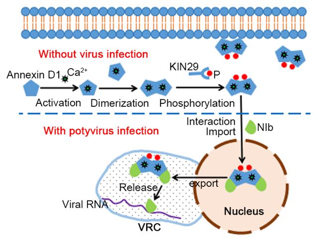 膜联蛋白(Annexins)是一类具有钙离子和磷脂结合能力的蛋白家族,在免疫调节中发挥重要作用。然而,膜联蛋白是否调控植物病毒侵染尚未得到详细研究。本研究发现,本氏烟膜联蛋白D1(annexin D1 of N. benthamiana,NbANXD1)可形成二聚体,并通过结合烟草脉带花叶病毒(tobacco vein banding mosaic virus,TVBMV)核内含体蛋白b(nuclear inclusion protein b,NIb)的C结构域与NIb互作。NIb能够将NbANXD1招募至核周区域,NIb-NbANXD1互作复合体与TVBMV的6K2蛋白共定位。进一步分析表明,本氏烟蛋白激酶29(phosphokinase 29 of N. benthamiana,NbKIN29)可与NbANXD1相互作用,并特异性地在NbANXD1的T204、T276和S286位点进行磷酸化。此外,钙离子(Ca²⁺)通过调控NbKIN29对NbANXD1的磷酸化作用参与TVBMV侵染。基因沉默、过表达、基因敲除及突变实验结果表明,膜联蛋白D1正调控马铃薯Y病毒属病毒的复制和系统侵染。总之,本研究揭示了马铃薯Y病毒属病毒NIb通过挟持膜联蛋白D1并利用蛋白激酶KIN29介导的依赖钙离子的磷酸化完成病毒自身侵染,为培育抗马铃薯Y病毒属病毒的植株提供了新的靶标。