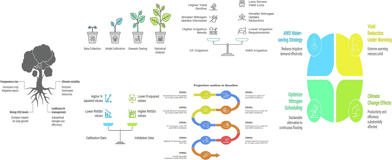 在全球气候变化加剧的背景下,水资源短缺与氮肥利用效率低下日益威胁水稻生产的可持续性。探究不同水氮管理策略在气候变化情境下对水稻产量和资源利用效率的综合影响,对推动气候智能型农业发展具有重要意义。该研究基于ORYZA(v3)模型,系统模拟了连续淹水与干湿交替两种灌溉方式,以及不同施氮策略对水稻产量、氮素吸收和资源利用效率的影响。研究表明,尽管干湿交替灌溉能持续降低水稻的耗水与灌溉需求,但在极端增温情景下仍可能出现产量损失,尤其在水分胁迫与施肥时机不匹配时更为显著。相比之下,采用190 kg·ha⁻¹的适度氮肥用量并配合“3:3:3:1”的分次施氮策略,能够在产量、水分利用效率和氮肥效率之间实现最佳平衡。研究进一步指出,大气CO₂浓度升高虽在一定程度上缓解了产量与效率的下降,仍然存在不确定性。此外,基于CMIP5气候情景的预测可能低估未来极端气候事件的风险,后续研究需引入CMIP6情景及更灵活的灌溉阈值,以增强预报的可靠性与适用性。该成果为气候变化背景下水稻生产的水氮协同调控提供了理论依据与技术路径,对保障粮食生产系统可持续性与资源高效利用具有重要指导意义。