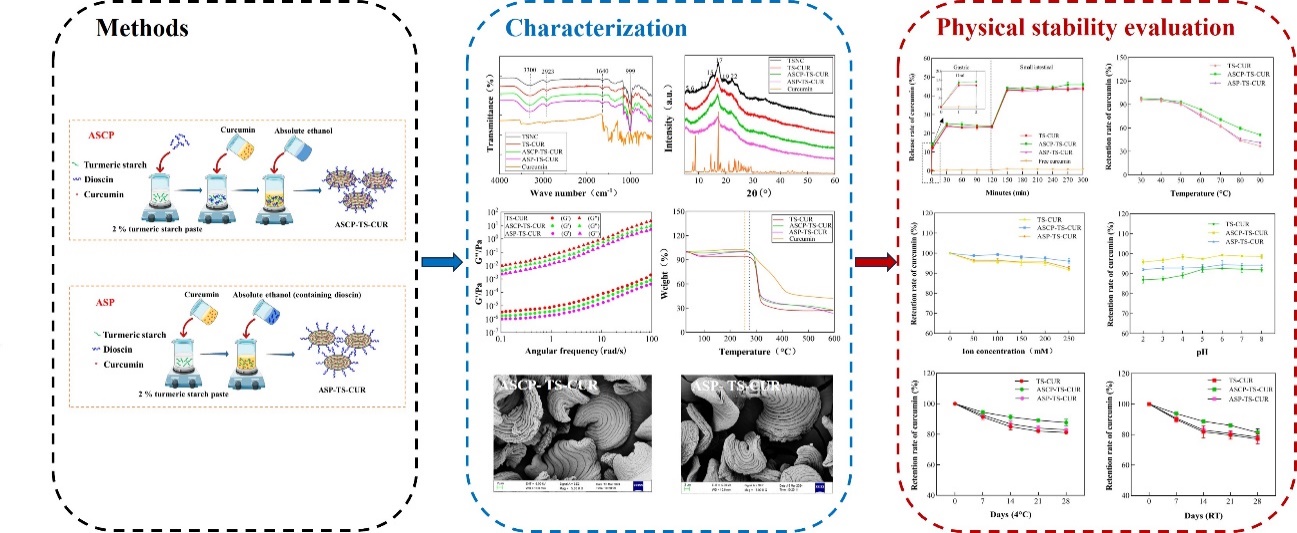 团队将天然甾体皂苷——薯蓣皂苷作为绿色表面活性剂,采用反溶剂共沉淀(ASCP)与反溶剂沉淀(ASP)两种方法,成功构建了姜黄淀粉-薯蓣皂苷-姜黄素三元纳米载体。研究结果显示ASCP法制备的载体性能最佳,粒径最小(约260.50 nm),包封率最高(59.06%),负载量达7.18 µg/mg。纳米载体结构致密,热稳定性和物理稳定性显著提高。体外释放实验表明,ASCP载体的姜黄素释放率和生物利用度分别达到游离姜黄素的约23倍和20倍,实现了肠道靶向缓释。该研究为利用天然成分构建高效、绿色的疏水性活性成分递送系统提供了新策略。