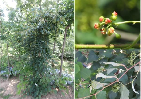 ‘紫霄’(品种权号20250700):树干极粗糙,皮孔密集,主枝呈半下垂姿态,当年生枝为紫红色,幼叶形态特殊,常出现畸形或三裂状,叶片中卵形,先端渐尖,基部截形,花序着花19-45朵。该品种花序繁密,可以作为优质蜜源树种,同时兼具观赏与经济价值。