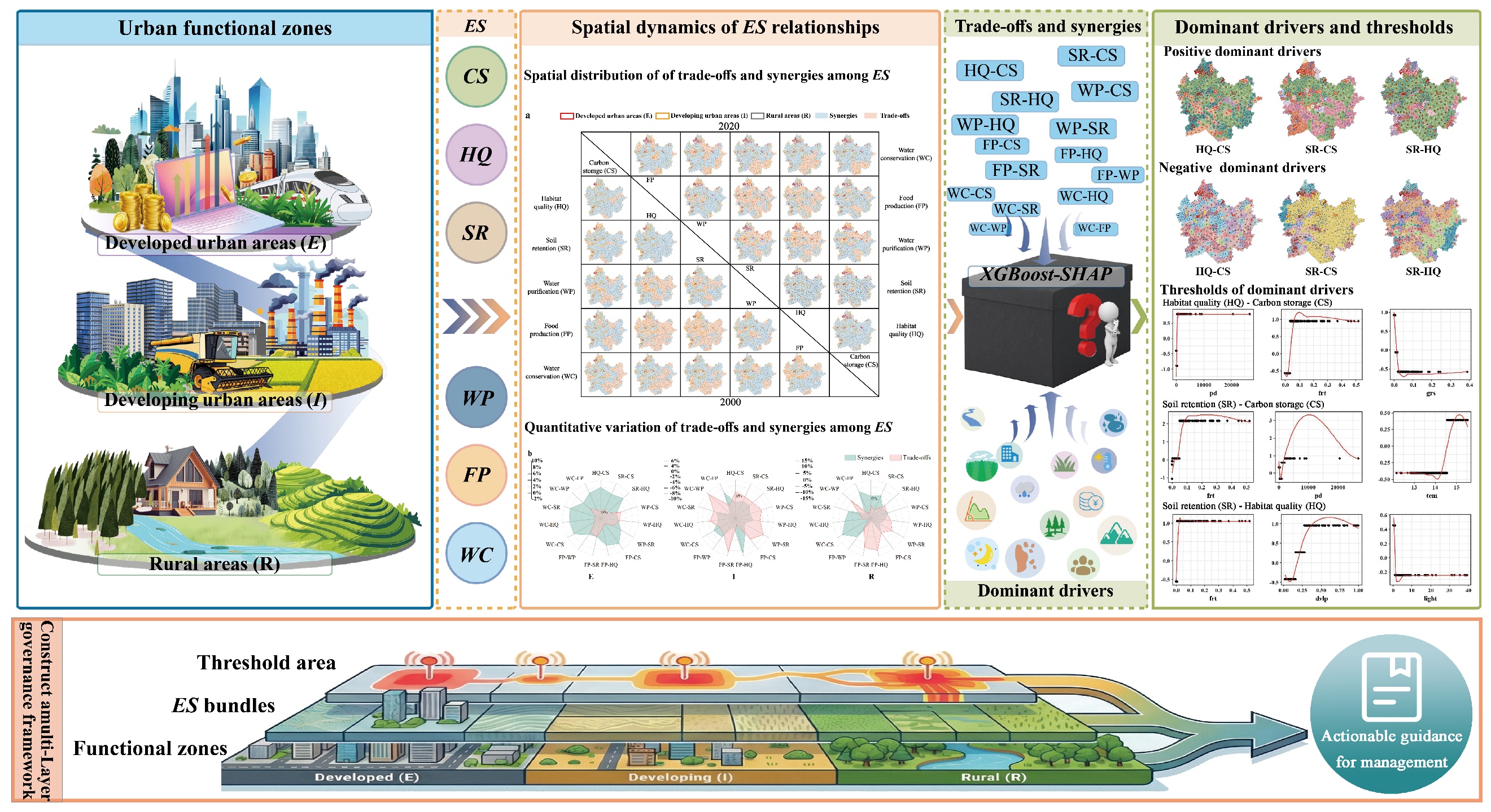 针对快速城市化背景下山地丘陵地区生态系统服务供给能力下降、权衡关系复杂且难以精细治理的问题,研究团队以鲁中南山地丘陵区为典型区域,构建“城市功能分区—生态系统服务簇—阈值区间”三位一体的“社会经济梯度与生态过程”双重分区分析与治理框架,突破了以往单一视角下生态系统服务管理的局限。基于人口、经济与建设强度,将区域划分为中心城区、城市建设区和乡村区,综合评估生境质量、碳固存、水源涵养、水质净化、土壤保持和粮食供给六类服务,从总体上刻画了不同城市功能分区下生态系统服务供给水平的空间分布特征及其随城市化变化的差异表现。研究发现,不同功能区生态系统服务关系明显分异:中心城区以调节类服务协同为主,城市建设区协同与权衡并存,乡村区以供给与调节服务权衡最为突出;其中,水源涵养与碳储存是对城镇化最敏感的权衡对。结合地理加权回归与XGBoost-SHAP模型,系统识别了主导驱动因子及其非线性阈值效应,揭示森林覆盖、气候条件与人类活动强度共同塑造服务关系演变,并存在森林覆盖率约10%、年均气温14.0–14.7 ℃、年降水量约900 mm等关键阈值。进一步将五类生态系统服务簇与城市功能区及阈值区间进行空间耦合,提出分区、分类型调控路径,为城镇化背景下山地丘陵地区生态系统服务协同提升与精细化、差异化治理提供了可推广的方法框架与操作路径。