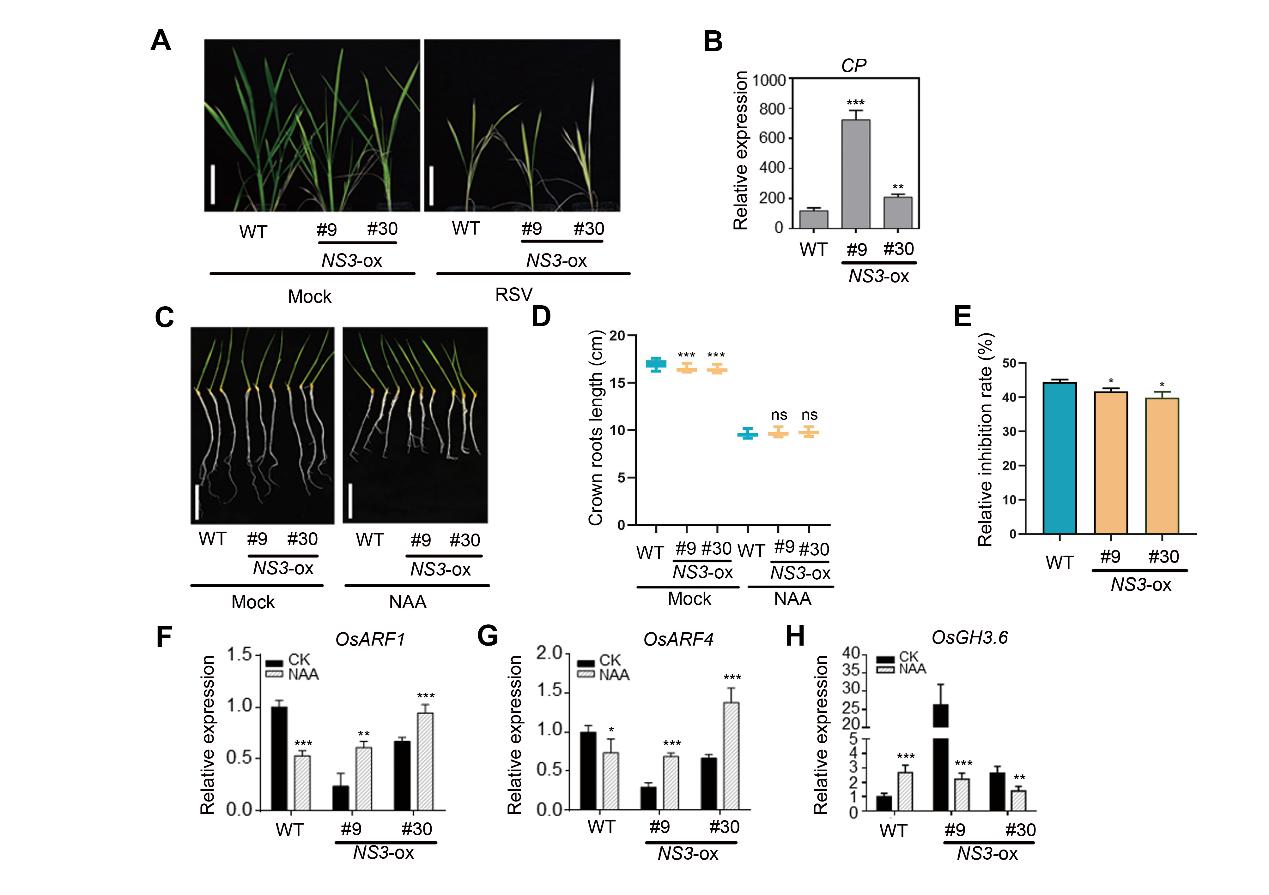 研究发现,RSV侵染导致水稻出现矮化与根系发育不良的表型,并显著降低水稻对外源生长素类似物NAA的响应敏感性。实验结果表明,RSV编码的NS3蛋白与水稻生长素信号通路中的OsIAA25蛋白互作。在水稻中异源表达NS3不仅增强了植株对RSV的感病性,同时也降低了对NAA的敏感性。以上结果表明,RSV NS3蛋白通过干扰生长素信号转导途径,促进病毒侵染并影响水稻生长。